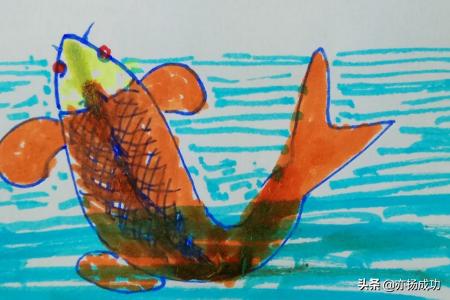 2、再用线条画出鱼的鳍部,并画出鱼身上的鱼鳞,用水彩笔涂出鱼背部的色彩。