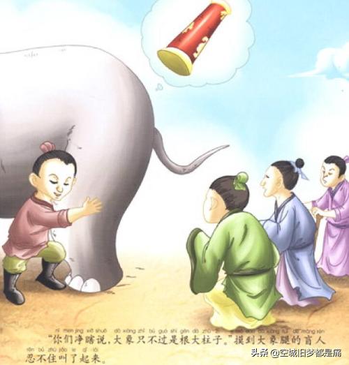 从前,有五个盲人,从来没有见过大象,不知道大象长的什么样,他们就决定去摸摸大象。第一个人摸到了鼻子,他说:“大象像一条弯弯的管子。”第二个人摸到了尾巴,他说:“大象像个细细的棍子。”第三个人摸到了身体,他说:“大象像一堵墙。”第四个人摸到了腿,他说:“大象像一根粗粗的柱子。”