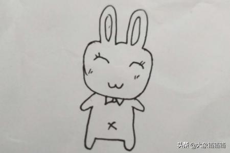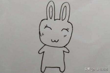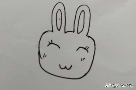 1、首先画出兔子长长的耳朵,左耳朵比右耳朵长,在右耳朵下画出一个小蝴蝶结,然后画出圆圆的脸,在脸上画出眼角、鼻子和嘴巴。