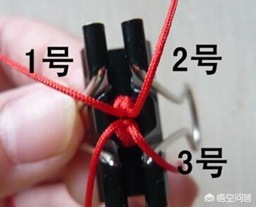 5、接下来就开始编玉米结了。玉米结是用4根线编的,我这里编了号。2号线压1号线,3号线压2号线,4号线压3号线,4号线从1号线穿过去,拉紧。